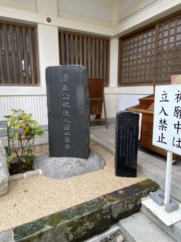 天正16年(1588年)6月27日に加藤清正公が27歳で肥後国入国から400年目にあたる昭和63年(1988年)に、先代社長と現社長が連名にてご奉納させていただきました。